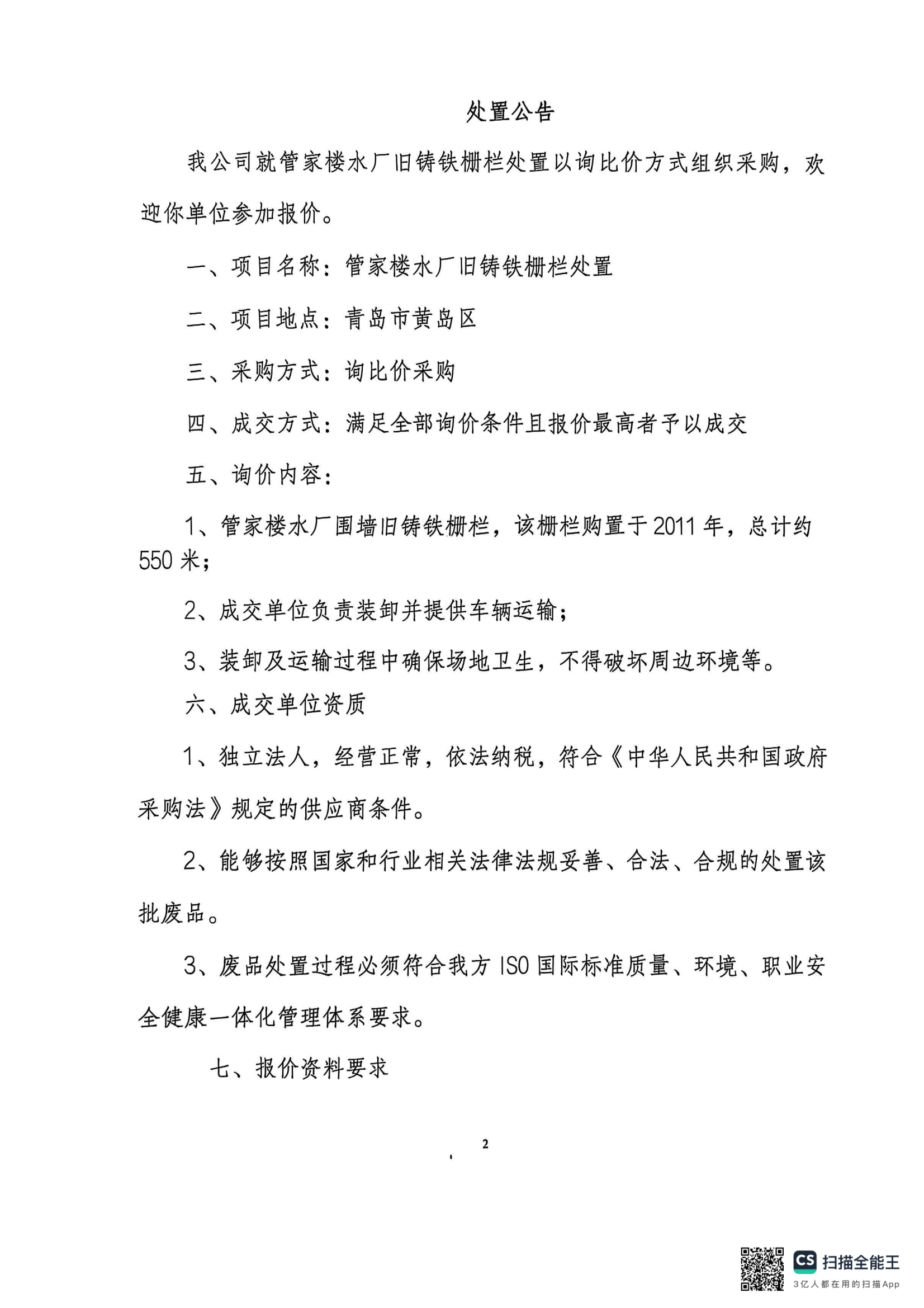 青岛碧海水务有限公司管家楼水厂旧铸铁栅栏处置公告
