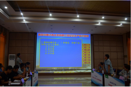 --记“安康杯”知识竞赛 6月21日,青岛引黄济青水务有限责任公司组织的2019年“安康杯”安全生产知识竞赛在我公司顺利举行。此次竞赛旨在促使职工深入学习安全生产基本知识,不断提升公司安全生产应急救援应急处置和抢险救援实战能力,营造全员学习安全、关注安全、参与安全的良好氛围。本次竞赛由来自黄济青水务、城阳水务、中禹管业和我公司的8支代表队,共计32名职工组成。引黄济青水务公司副总经理张启卫出席了本次竞赛并作出动员,我公司副总经理汪利华出席了本次活动。 本次竞赛活动分为两个环节:第一环节为实践操作;第二环节为现场答题,每支参赛队由4名队员组成。竞赛内容涉及现场模拟救援、安全生产法律法规、安全管理、安全技术、职业健康、安全卫生防护与求逃知识等。 ![]() 第一环节首先是我公司候可臻、张扬、李仕钊、周兆鹏组成的护航队出场,他们沉着冷静,动作迅速仅用5分53秒就完成了救援。接着是吕福鹏、庄春花、薛钊、赵瑞龙组成的泰山队参赛,他们喊着口号有序进场,用时6分48秒完成救援。经过一上午紧张的比拼,护航队和泰山队分别获得95分和91分的好成绩位列第一,第二,取得了开门红! 下午是紧张激烈的答题竞赛环节,选手们沉着应战,渐入佳境。本环节是选手们知识掌握的熟练度交锋,由必答题、抢答题、风险题三个部分组成,必答环节大家对答如流,各队紧紧咬住比分,没有拉开差距。抢答环节,比赛迎来了一个小高潮,在这部分,选手们不仅展示了他们丰富的知识储备,更是展现了他们快速的反应能力!对于有备而来的选手们来说,是成竹在胸,对于默默观看的观众们来说,是知识的盛宴。最后的风险题最激动人心!在最后的白热化阶段,依据本队的基础得分,各队是选择保险为上,胜券在握?或是全力一搏,绝地翻盘?