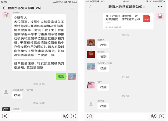 支部通过微信群、短信等多种方式向全体员工及时传达上级有关防控工作的通知,号召广大员工尽量少外出、少聚集,引导员工增强预防意识和措施,降低感染风险。