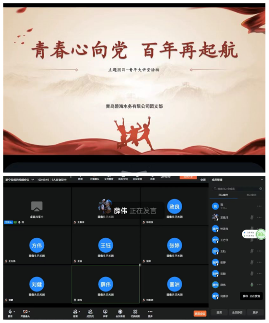 1922年,在党的直接领导下,中国共产主义青年团成立。建团百年以来,共青团始终紧跟中国共产党的领导,为党和人民奋斗。2022年5月10日,庆祝中国共产主义青年团成立100周年大会在京隆重举行,习近平总书记发表重要讲话,他强调:“一百年来,在党的坚强领导下,共青团不忘初心、牢记使命,走在青年前列,组织引导一代又一代青年坚定信念、紧跟党走,为争取民族独立、人民解放和实现国家富强、人民幸福而贡献力量,谱写了中华民族伟大复兴进程中激昂的青春乐章。” 习总书记的讲话在青年团员中引起强烈反响,为进一步深入学习领会习近平总书记的重要讲话精神,感悟永远听党话、跟党走的初心使命,我公司团支部于6月9日下午举行了“青春心向党 百年再起航”青年大讲堂主题团日活动,本次活动以钉钉视频会议形式开展。本次活动由团支部书记耿宁担任主讲人,首先带领公司全体团员一同回顾了习近平总书记在庆祝共青团成立100周年大会上的重要讲话,并结合公司先锋党员事迹学习为大家梳理讲解了“肩负起党和国家的希望,在实现民族复兴的赛道上奋勇争先”的历史使命和下一步工作方向。 新征程上,共青团必须坚持为党育人,不断增强引领力。火热的青春,需要坚定的理想信念。事业的传承,要靠精神的代代传承。会上,主讲人向大家展示了公司四位先锋的先进事迹,党员们恪尽职守、尽职尽责的工作精神和榜样力量感染着每一位青年团员。大家在交流环节踊跃发言,从自己身边的优秀事迹到自己以后的努力学习方向等角度出发进行了分享。 正如习总书记所说的“千百年来,青春的力量,青春的涌动,青春的创造,始终是推动中华民族勇毅前行、屹立于世界民族之林的磅礴力量!”作为公司日后不断发展壮大的新生力量和主力军,我们青年团员们应向先锋和优秀党员们学习,自觉担当尽责,追求进步,在工作上发挥带头作用,争做敢于斗争的模范。 张婷:作为青年职工,要将我们身边的优秀党员的奋斗精神传承下去,多学习知识来提升自我,提高思想精神觉悟,提高对待工作的责任心。 刘健:马克思主义就是本手,直接套用在中国不加以改变和创新就是俗手,只有高举新时代中国特色社会主义旗帜,筑牢中华民族共同体意识,才是妙手。 王方伟:我身边学习的榜样范厂长,他作为一名老党员,工作认真负责,积极主动,对公司提出水厂内部隐患或者不好的地方能及时的整改,执行力强,是我们年轻人学习的榜样。 王钰:在未来的日子里,我们应当刻苦学习,不断创新,不断提升自身素质,脚踏实地,求真务实。在生活中,我们也要迎难而上,攻坚克难。 王晨沣:历史和现实昭示我们,只有坚持党的领导,共青团才能团结带领青年前进,推动青年运动沿着正确政治方向前行。在单位里,很多老党员一直都是公司稳定发展的中流砥柱,他们脚踏实地、爱岗敬业的工作态度让我敬佩。水质的陈经理就是我身边的榜样,他面对生产中的各种问题,都要第一时间进行研究,并马上进行行之有效的反馈。发挥模范带头作用,确保供水稳定、优质完成,在出厂水耗氧量标准、消毒副产物、余氯控制等方面都有显著业绩。实验室更是没有发生一起安全生产、环境污染事故,受到公司一致好评。纸上得来终觉浅,绝知此事要躬行”是工作以后最为深刻的体会,当我真正的走入行业,才懂得自己欠缺的还有很多。我也渐渐从“拉着学”到“主动学”,什么有用学什么,需要什么学什么。时刻牢记服务社会,让红色精神依旧炽热!