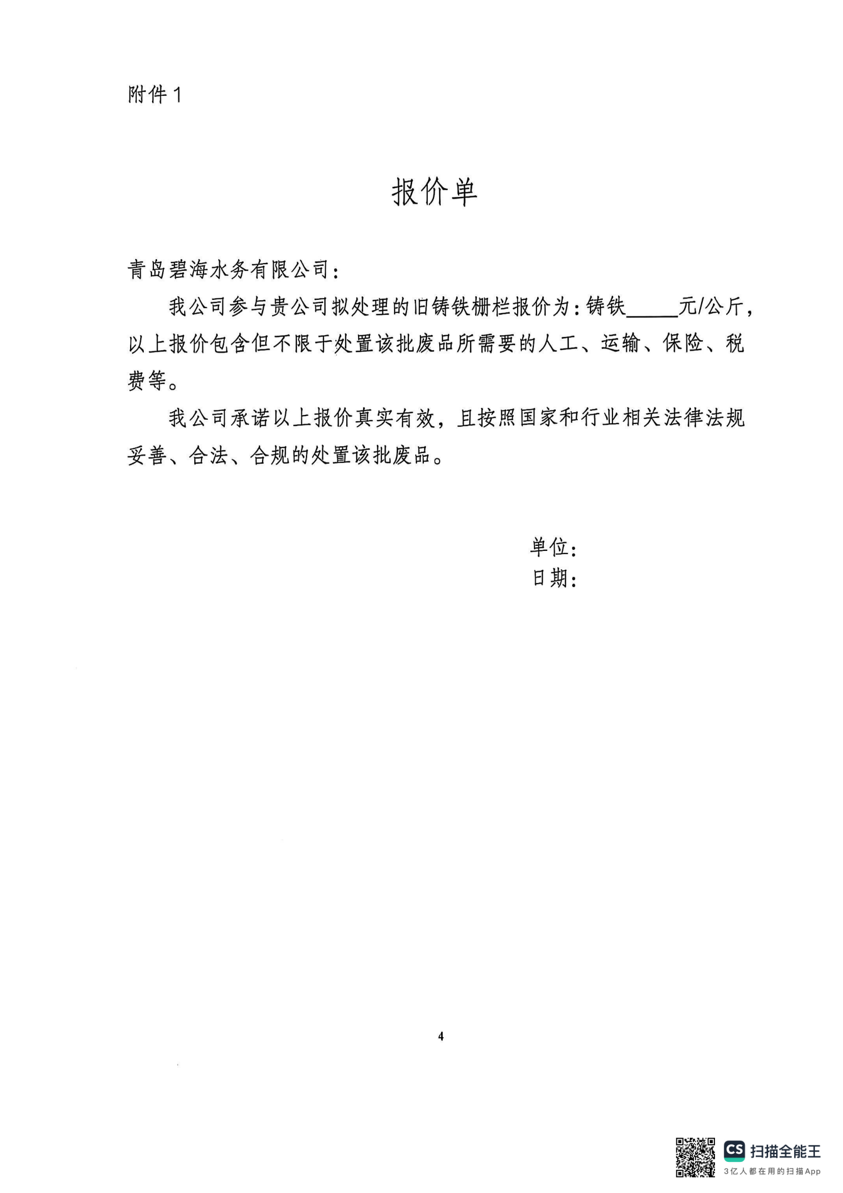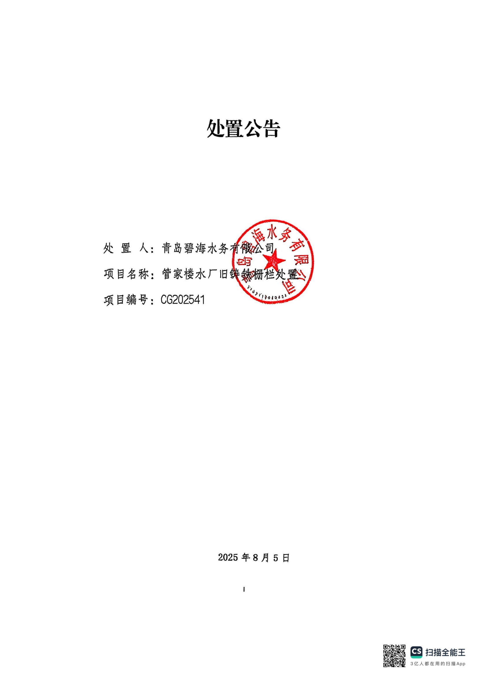 青岛碧海水务有限公司管家楼水厂旧铸铁栅栏处置公告
