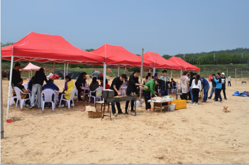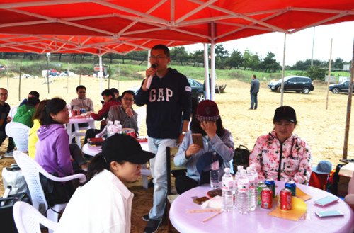 经过一系列热闹非凡的趣味运动比拼之后,大家感到累并快乐着,来到棚内稍作休息便又高兴的投入到自给自足的烧烤活动中。热心的数名职工到烤炉前,分工合作,主动为大家进行烧烤服务。烧烤间隙,团支部书记刘蓓鼓动两单位人员为大家献上歌曲调动气氛,现场每个人笑容满面、无比欢乐。